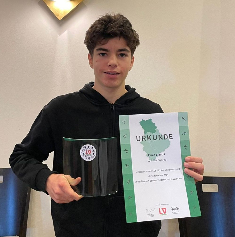 Paulo Bianchi vom LC Adler Bottrop hat im Jahr 2025 einen neuen Regionsrekord in der Altersklasse M14 über 1500m Hindernis in einer Zeit 5:10,94 min aufgestellt und wurde bei der Regions Jungendversammlung dafür ausgezeichnet ... Herzlichen Glückwunsch. -